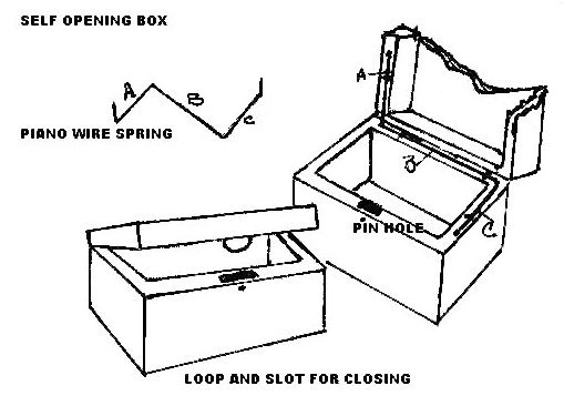 Continuing with box material, there is a historical box described by Tony Andruzzi in the little book called DEMON'S DIARY by Masklyn Ye Mage, which got no more than a half a page and all too brief instruction of it's construction. It was a self-opening box, which depended upon the humidity and temperature for timing. It is a most clever application of magician's wax or mortician's wax and I will attempt to describe my version in this lecture. Using the line drawings therein, you can see the basics of the box and the placement of the piano wire spring.