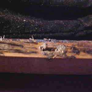 Tony suggested using brads or staples to hold the piano wire in place. For me this caused the lid to sit a bit too open and looked suspicious. Using a Dremel tool with a circular saw blade about 1/8 inch thick, a groove was cut into the edge of the wood about a 1/4-inch deep. This allowed the wire to be inset and hidden with the use of epoxy putty to fill the groove after the wire was in place. The ends of the wire were bent and tiny holes drilled at the end of the groove allowed the ends to be secured in those holes so the tension on the wire when the lid was closed would not pull the wire up from its resting place in the groove. Rather than a bar to slide into the slot where the wax was to be packed as Andruzzi did, I used a loop of wire like a staple as illustrated in the drawings. A small hole was drilled from the outside, which allowed a pin to be inserted which held the lid shut as it is under tension from the spring and tends to spring open when least expected.