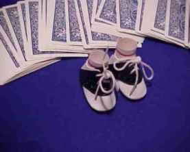 My favorite is the small pair of shoes into which the index and second finger are inserted. These came from a doll shop and are tiny oxfords that have been fitted with a cylinder of white card stock to look like stockings. The led line at the top matches that of many athletic cotton stockings. In the U.S. there is a television commercial about letting your fingers do the walking through the Yellow Pages of the phone book and they use a set of shoes like these attached to someone's fingers and filmed them doing the walking. If a spectator is to do this some blue tack or other sticky substance must be placed at the bottom of the cylinder so the shoes will stay on someone else's fingers. It is just stupid enough to be cute and the ladies love this version for some reason. Takes them back to childhood I guess.