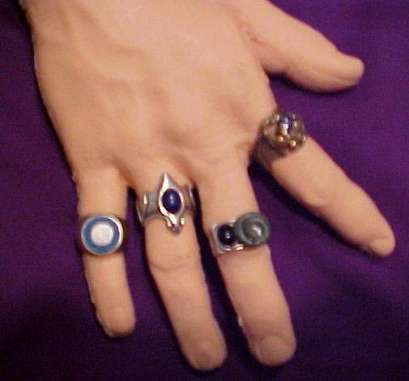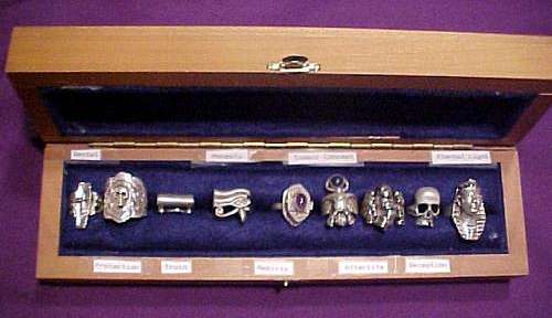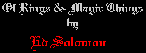 "RING OF PROTECTION". "Rings of Power, We decided that DeNomolos was either enchanting us with a new spell or that he was getting ready to assault our minds with more of his historical rhetoric. Whatever the case, we were ready. Boredom was not the case this evening. DeNomolos presented some most interesting information. "Having neither beginning nor end, a ring stands for eternity and perfection and is therefore an ideal pledge of faith between two people." "This quote", he said, "is from the book FINGER RING LORE written by William Jones in 1877 and it expresses the basic purpose of rings as seen by the people of his generation." "A symbolic gesture pledging one's troth to another." This was only one of the ring mysteries as we were about to discover. "From the days of prehistoric man, rings of bone and tissue, twisted braids of the stems of flowers and herbs were worn for protection and healing. Every civilization that followed has made use of rings for adornment and ritual purposes." "A ring was the sign of the wearer’s authority. In Genesis, chapter 41 it says ' And Pharaoh said to Joseph, "Behold, I have set You over all the lands of Egypt." And Pharaoh took his signet ring from his hand and put it on Joseph's hand..... Thus he set him over the lands of Egypt.' "Every Cardinal, every bishop and every Pope has worn a ring of power' Every King, every Monarch and Potentate has sought and worn such rings of great magical power. Every Nun wears a symbolic wedding ring signifying being wed to Christ. King Solomon in all his Glory was said to have a ring so powerful that it would allow him to summon demons and allow him to fly at will." "Rings of silver, rings of gold, rings of brass and copper. Rings of iron and coffin nails, horseshoe nails, Jade, Crystal. Hematite, Jasper, Carnelian are still available today if you know a good jeweler or and alchemist." "Cure your gout and rheumatism with the right combination of metal and stone. And yes, even today, people believe and wear these kinds of rings." "The goldsmith was called upon to fashion rings of fashion, passion and poison. A receptacle beneath the stone need be only quite shallow to hold enough of the right poison to flavor anyone's favorite drink. Rings today hold all sorts of gadgets and gizmos including watches, magnets and mirrors as well as precious stones." "Everything from cramps to epilepsy could be cured with the proper ring. A gold ring rubbed on a sty was supposed quite effective. If the names of the members of the Holy Family were inscribed inside the ring, the power was greater and the names of saints and of the three wise men were other talisman inscriptions that provided great protection." "Puzzle rings were made in two parts so that a single ring could be shared with a friend. Names like mood rings, engagement rings, friendship rings and wedding rings glamorize the article and are but reminders of the past histories of the rings of power. A sorcerer might have a collection of rings depending on what special spell needed to be cast. he might select a perfect ring for a perfect spell. he might have s ring for each day of the week and special ones for Holy Days." "Our language is full of ring references like, 'The ring of Truth', 'That has a nice ring to it.' ' Give me a ring sometime.' ' Would you like for me to ring you in?' "All in reference to magic circles and finger rings, these are but a few samples of what is left of Ritual Magic done with rings. Where have the legends gone, Where are the charm rings, the posy rings, the rings of silence, and the rings of fear? Where is the great knowledge that once was but now is forgotten? Are you just a bit curious as to where this is all going? Do you believe in Magick? "Perhaps you would like to be a first hand witness to...... some small spell. Something not too dangerous but convincing enough that you might just want to investigate further the Magic of Rings." Opening an ornate box, DeNomolos displayed a set of unusual rings. Each was labeled in the box and they had names like the Ring of Deception, The ring of Truth, the Ring of Protection, the Ring of the Afterlife and so on. This could have been the collection of a sorcerer and knowing DeNomolos, it probably was. |