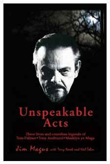 Many stories abound about Tom Palmer, a.k.a.Tony Andruzzi & Masklyn ye Mage, many of which he himself told but there are also many that others told about him (especially his long time good friend Charles W. Cameron). After a lot of work on the part of Jim Magus with Terry Nosek and Neil Tobin, a book about Tom Palmer and his alter ego's was finally published in March 2011 (not Halloween 2010 as originally planned). Unspeakable Acts by Jim Magus
