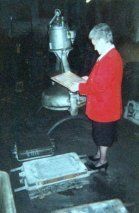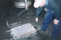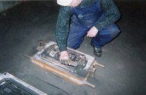 A resin master or 'pattern' of the plaque is first made and this is used to create the mould for the casting. Above you see the master after it has been removed from the newly formed mould, seen on the right. A weighted lid is then placed on the mould in readiness for the molten bronze being poured in.
