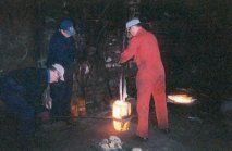 The crucible of molten bronze is carefully checked for correct temperature and scum removed from the surface before it is lifted out of the heat.