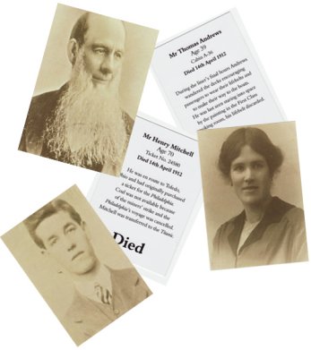 either person A or B. The performer then states that the old coin was taken off one of the recovered bodies from the Titanic and the fountain pen was used by a clerk to write out the list of all the survivors. Person A is asked to turn their photographs over and on doing so they see each photograph has on it's back, the name of the person, some details about them and that they DIED! Person B turns their photographs over and sees the similar details but all their photographs have SURVIVED printed on them! The discard pile is turned over and there is a no sequence mix of both the DIED and SURVIVED photographs! After the initial amazement, the spectators may ask how this was possible to which the performer replies, "as I said, it was an experiment and sometimes the results are very poor, especially if the helpers know what is going on. I can't explain it away and it seems to be just another mystery surrounding the Titanic". At this point, the performer can sit back and relax as the spectators spend the next half hour or so looking at all the photographs and reading the details on the backs. Onlookers too will want to read the backs and quite often a chat session about the Titanic takes place.