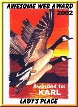July 1st., 2002. * "Hello Karl, it's always nice to have former award winners come back to reapply for a new award. As always your website is outstanding and I have awarded you my 2002 'Awesome Web Award'." Lady Lynda. |