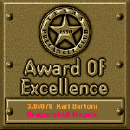 July 8th. 2001. * "I am pleased to present you with my award as your website scored a total of 70 out of a potential 100. The design scored a 25 out of 30. My Award Of Excellence is rated 3.0 by Award Sites, 4 by United Award Givers and 7 by Web Awards". |