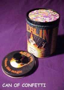 Now we can examine the canisters. Two 35-MM film canisters are glued side by side to the inside of the tin canister. They are about an inch below the edge of the rim. They are held in place by strips of epoxy putty (my favorite medium) and are secured when the putty has been smoothed and hardens. At the same time three little shelves of this material are placed around the inside circumference just below the rim to accommodate the confetti disks and keep them from falling down into the canister. When all these preparations are completed the interior is painted flat black and the multifaceted presentation can begin.