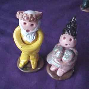 I would like to assign a bit of outside reading that will illustrate this first lecture. If you do not have this material at hand you might check with one of your neighbors and see if they might share with you this useful information. In today's illustration we are going to examine the first volume of the Punx trilogy, namely "MAGICAL ADVENTURES AND FAIRY TALES. As I am particularly fond of a couple of these stories and since I have added them to my own repertoire, these are the ones I will address in this material. If you are familiar with the story of the Pixie Princess and her Magic Cloak you will immediately know what we are talking about. If you do not then you must read the material for it to make any sense. To begin with, there is this wonderful material called Fima (Fimo in Europe) Sculpting clay available in your local arts and crafts store. It comes in a multitude of colors which can be mixed and kneaded to make the colors that you might not find. There is another material called Skulpty Clay that you can buy in bulk quantities but I have only been able to find white. It is my preference. The Fima is a bit pricey if you have big projects. The Skulpty can be rolled, shaped, molded and pressed into almost any shape you might want. It can be hardened by baking in a low oven and can be painted with acrylic paints, sealed and finished with clear acrylic spray and achieve some most astonishing results. In the Punx play, which incidentally was not his to begin with but like so many stories, handed down from generation to generation, is a children's story. When I produced my version I did not try for physical accuracy in the little characters but instead tried to make them look like children's recreations. The faces are not formed but are simply punched for features. The coloring scheme was done outside the lines, so to speak but the characters do match pretty well the way Punx described them. The castle is a three fold screen using Sculpty on the surface of cardboard. The tower was made from a kitchen towel center roll. cut and covered with Skulpty it has slots, which let it sit over the corner of two of the castle walls. The trees are from the Christmas shop and have Sculpty bases painted to look like dirt. The Punx story called for a miniature pistol but I elected to make the weapon of choice a club and in the story call it a magic club named IBM. The mirrored bottle was at one time a cologne bottle but the opening in the neck was large enough to insert a rolled portion of silver plastic which straightened out inside the bottle to create the mirror glass gaff. If you examine the pictures in the book you will see that mine match pretty well. The characters are no more than four inches high. The mechanical pencil vanish mentioned in the Punx story is relatively easy to make and some of the big, thick ball point pens really adapt nicely to this gimmick. The small square of silk came form a little 9 inch kerchief but had to be re-hemmed to make it vanish in the pencil prop. While the story line and the prop design follow pretty much the script outlined by Punx, the thing that makes my version pretty unique is the fact that the story is recorded and I wrote background music for each of the characters. Every time the character's name is mentioned on the tape, the motif music repeats itself over and over. This gives me time to walk the characters about the table like a child playing with little action figures. While it eats up a lot of time it is a charming way to present this particular story. |