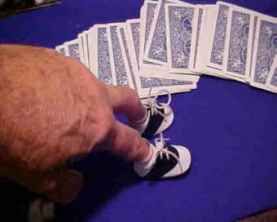 My favorite is the small pair of shoes into which the index and second finger are inserted. These came from a doll shop and are tiny oxfords that have been fitted with a cylinder of white card stock to look like stockings. The led line at the top matches that of many athletic cotton stockings. In the U.S. there is a television commercial about letting your fingers do the walking through the Yellow Pages of the phone book and they use a set of shoes like these attached to someone's fingers and filmed them doing the walking. If a spectator is to do this some blue tack or other sticky substance must be placed at the bottom of the cylinder so the shoes will stay on someone else's fingers. It is just stupid enough to be cute and the ladies love this version for some reason. Takes them back to childhood I guess.
