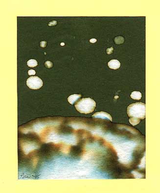 "I am attaching a print that I think you might get a kick out of. It is a Poinc original. On the back he has labeled it "Landing" and written a price of $80. Apparently he meant to sell it but instead, he sent it to me with another note written in pen... "My Home Planet."  Hey, maybe that's where he is now?" Larry White