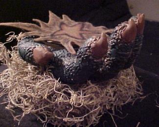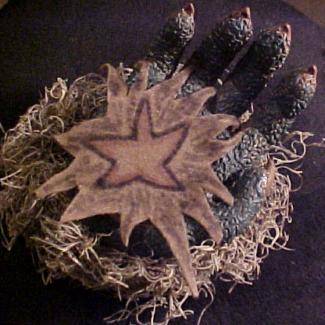 The hand was covered with a thin coat of putty and then worked for the scale effect. Nails were turned into claws and warts were added for effect. A little acrylic paint and you have a beautiful prop. The base was covered with sargassum moss for hanging baskets and can be found in any nursery. It has the same appearance of Spanish moss that hangs from the trees in the southern parts of the country. Applied with a hot glue gun, it covers the base and makes an interesting "Nest" in which the hand sits. One final step was to take a piece of chamois skin and cut a patch large enough to cover the disk, which serves as the palm of the hand. The patch was emblazoned with a symbol befitting Cthulhu and was attached with hot glue. The disk is the activating switch and the weight of a glass or a deck of cards will start the battery-operated motor and the hand goes in a straight line wherever it is pointed. |