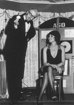 Bob Lynn performs the "Paper Balls Over The Head" effect with a female spectator at a promotional meeting for a data processing group. (Circa, 1979)