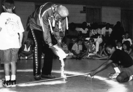 Raven pouring corn meal to prepare the Medicine Wheel (Sacred Hoop) for ceremony. (Circa, 2001)
