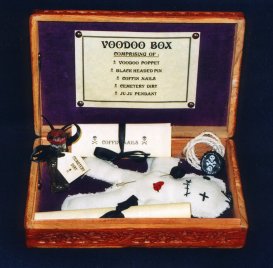 The VOODOO BOX is a lovely hand made box containing many strange items. Although there are many effects possible with the contents of the box, none of the items are gimmicked in any way that can be detected. When open, spectators see a wonderful display. You can spend time taking each item out and allowing your spectator to handle the item while you tell them all about it's use in Voodoo practices! THE CONTENTS OF THE BOX ARE:- Voodoo Doll or
